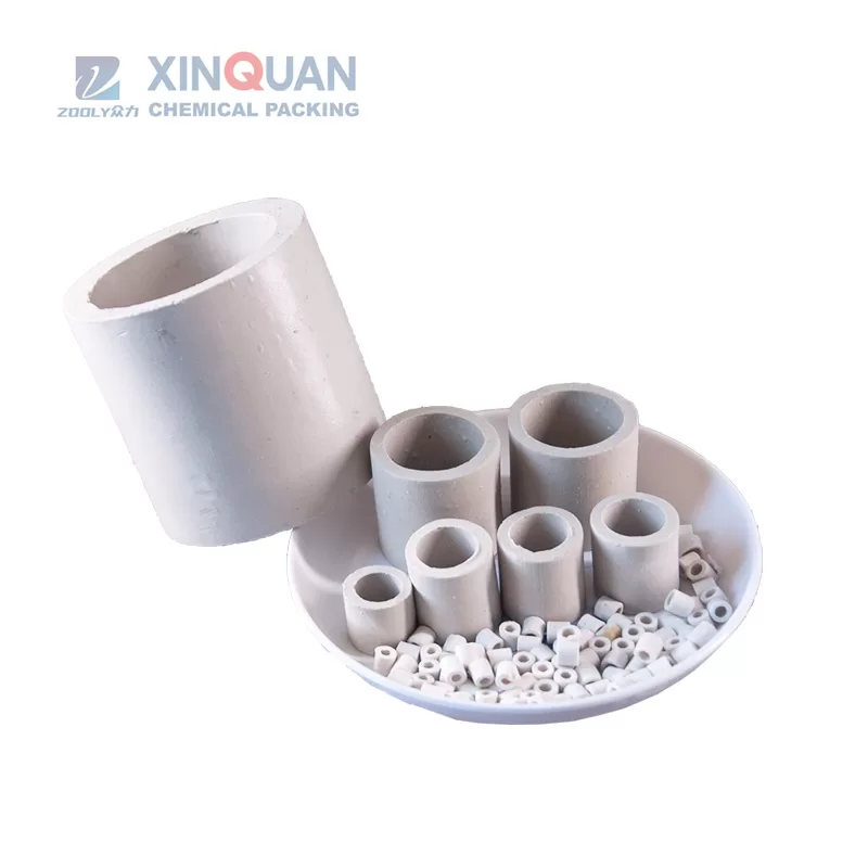 Ceramic Raschig ring belongs to a kind of ceramic random packing developed early. Its shape is simple, and its height and diameter are the same as the obvious characteristics of its appearance. Large-size raschig rings (above 100mm) are generally packed in a regular way, and Raschig rings with a size below 90mm are generally packed in random piles. The ceramic Raschig ring has excellent acid and heat resistance, can resist corrosion of various inorganic acids, organic acids and organic solvents except hydrofluoric acid, and can be used in various high temperature occasions.